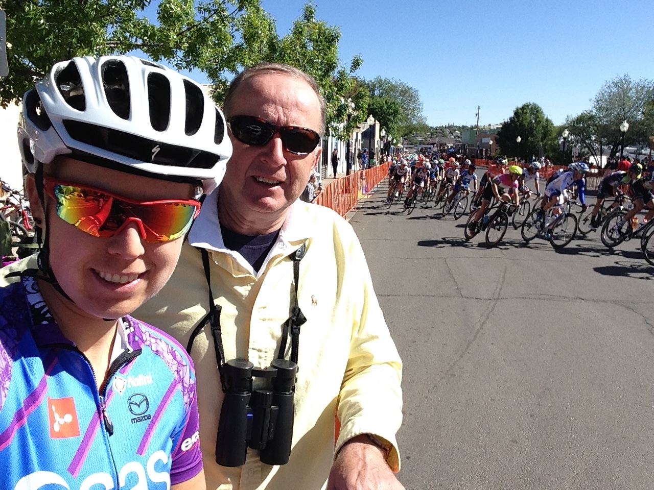 My favorite stage of the race. I wanted to be top 10 and knew I could even be top 5. I stayed relaxed throughout the race and in good position. There was a crash on the hill about 5 laps in which I had to get around and catch back on, but it wasn’t any big worry. Just left a little apprehension in the midst of riding so close to others. With 9 laps to go I focused more and set myself to stay in the top 20. 3 laps to go was hard and fast with everyone moving and working for position. At 1 to go I was set up perfect, 7th or so wheel and holding strong. But when the turn came going into the hill a couple girls came up on the corner and “pinched” me off my wheel. Meaning they got in a position and so close that I had to ease off or risk a crash. Up the hill I worked as hard as I could knowing it was the crucial moment. Into the downhill in about 20th, then passed some girls before the final turn. In the finishing stretch I gave it my all and crossed in 16th. I know I could have done better, but after this hard week I held strong. This is a picture from the race, my dad came to watch and cheer me on.